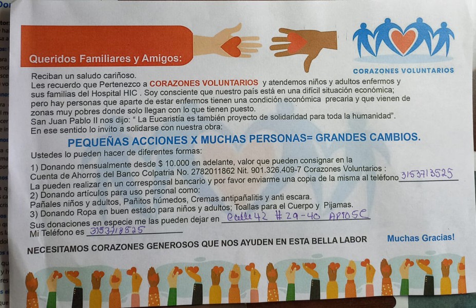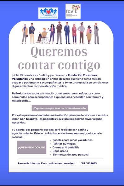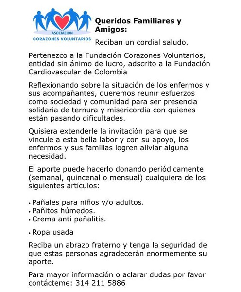 Corazones Voluntarios es una fundación sin ánimo de lucro en Bucaramanga, comprometida con brindar apoyo social y humano a pacientes y familias en instituciones de salud. Nos enfocamos en acompañamiento emocional, asistencia práctica y recursos para mejorar la calidad de vida. Trabajamos en la Fundación Cardiovascular de Colombia, ofreciendo programas de donaciones, alfabetización y acompañamiento social. Únete a nuestra misión de hacer la diferencia en la vida de quienes nos rodean.